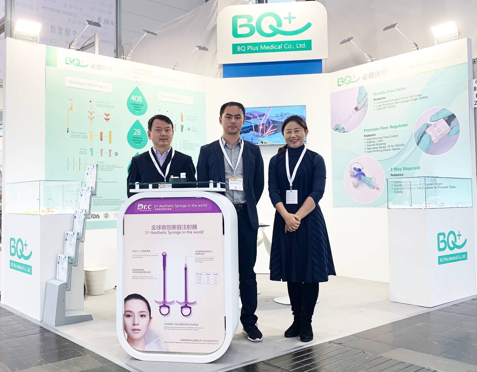 在BQ +品牌創(chuàng)始人的8bp23展位上,曹女士帶領(lǐng)公司負責(zé)歐美市場的銷售團隊如期參加了一年一度的德國醫(yī)藥展,為客戶提供免費的解決方案,技術(shù)解答和樣品。